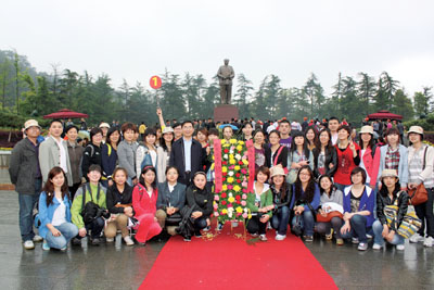 雨越下越大,就像我们追寻红色足迹的步伐一样,激动的心情难以言表。步行来到铜像广场,辽阔的天空下,满山遍野盛开的映山红簇拥着巍巍耸立的毛主席铜像,仿佛是主席在欢迎我们的到来,雨水冲洗着每个人的心灵,望着铜像,似是故人来,让我们倍感亲切和思念。怀着无比崇敬的心情,我们举行了庄严的缅怀仪式,团长代表全体党员向主席铜像敬献花圈,以表达我们深深的敬意和思念之情。每一位党员心潮澎湃,主席的形象屹立在天地之间,更是活在每一个人的心中,主席是人民的主席!此时此刻,我真正体会到了主席伟大的人格力量:天地合一,日月同辉!