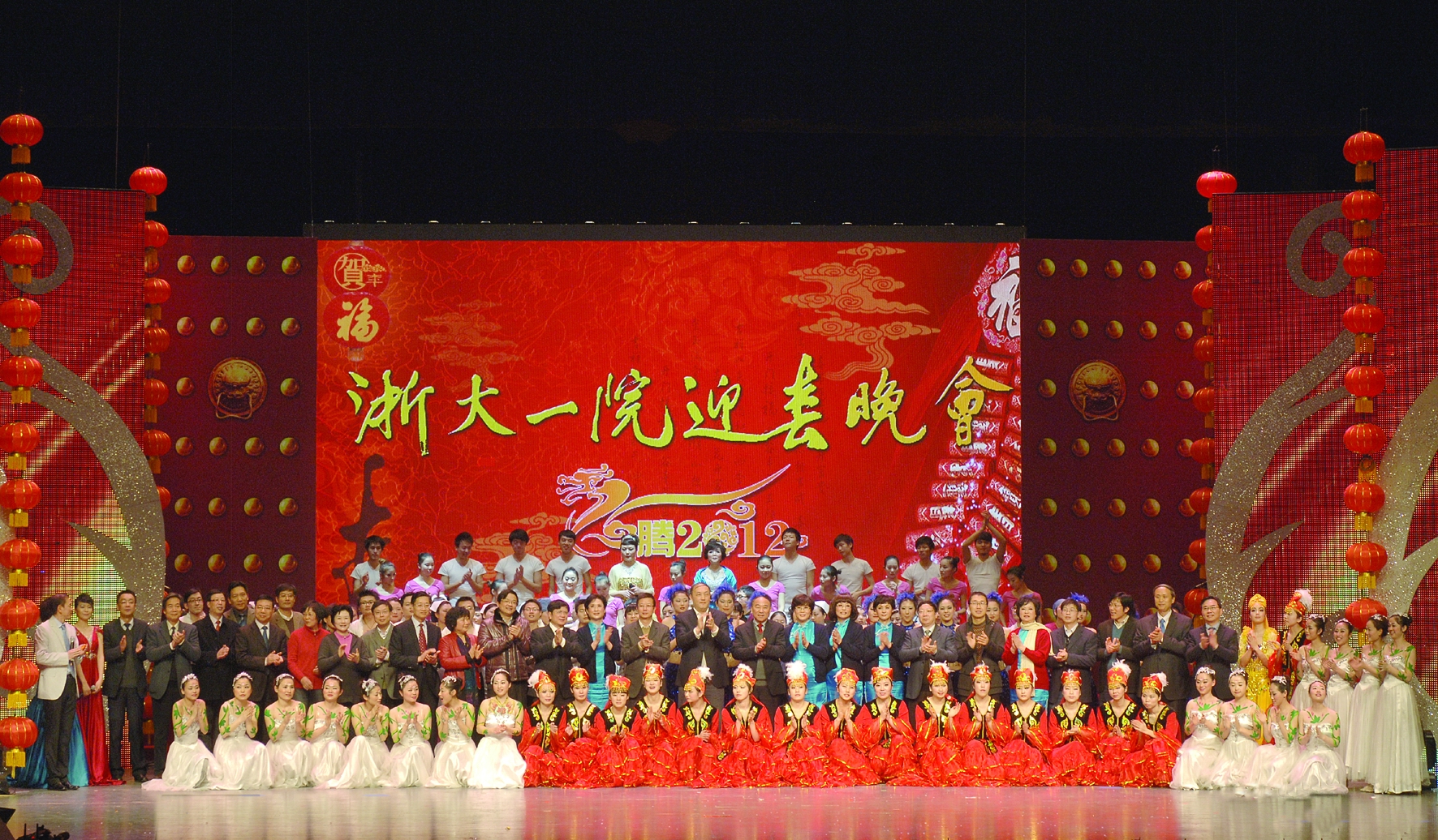 玉兔归时羡春色,金龙腾处看雄姿!伴随着收获的喜悦,满怀着奋进的豪情,2012年1月7日的夜晚,整个杭城虽是寒风凛冽、天寒地冻,但浙江省人民大会堂内却是暖意融融、欢歌阵阵、舞姿翩跹、掌声如雷,我院迎春晚会暨总结表彰大会在这里隆重举行。中国科学院院士、浙江大学校长杨卫教授,浙江省卫生厅副厅长马伟杭,浙江大学党委副书记邹晓东教授、郑强教授,中国工程院院士、我院院长郑树森教授及医院党政领导班子成员等领导在前排就坐,与广大干部职工欢聚一堂,欣赏由我院员工自编自导自演的文艺演出,共迎新春佳节!