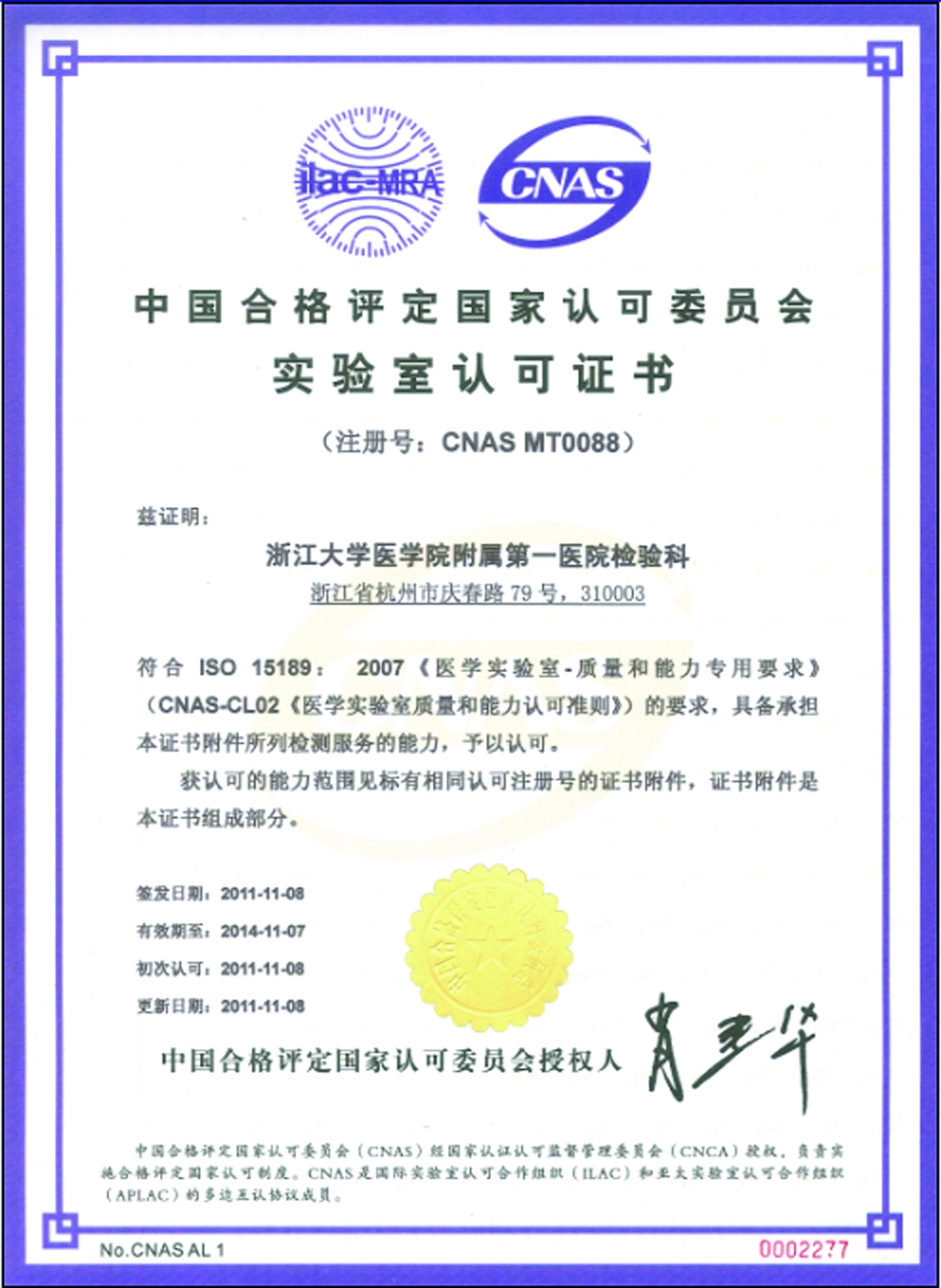 2011年7月21-24日,中国合格评定国家认可委员会(CNAS)对我院检验科进行现场评审。现场评审专家由丛玉隆教授带队,依据ISO 15189认可准则及2011年最新版的专业领域应用说明,对临检、生化、免疫、细菌等专业组进行了严格、细致的检查和评审。专家组对浙医一院检验科在管理规范、质量控制、服务理念、人员素质、技术水平、科研水平等方面给予了高度评价,充分肯定了科室的技术内涵和结合自身实践建立的管理体系。同时,也指出了存在的问题和不足,经过3个月整改并提交不符项整改报告。于2011年11月8日,正式签发CNAS认可证书。