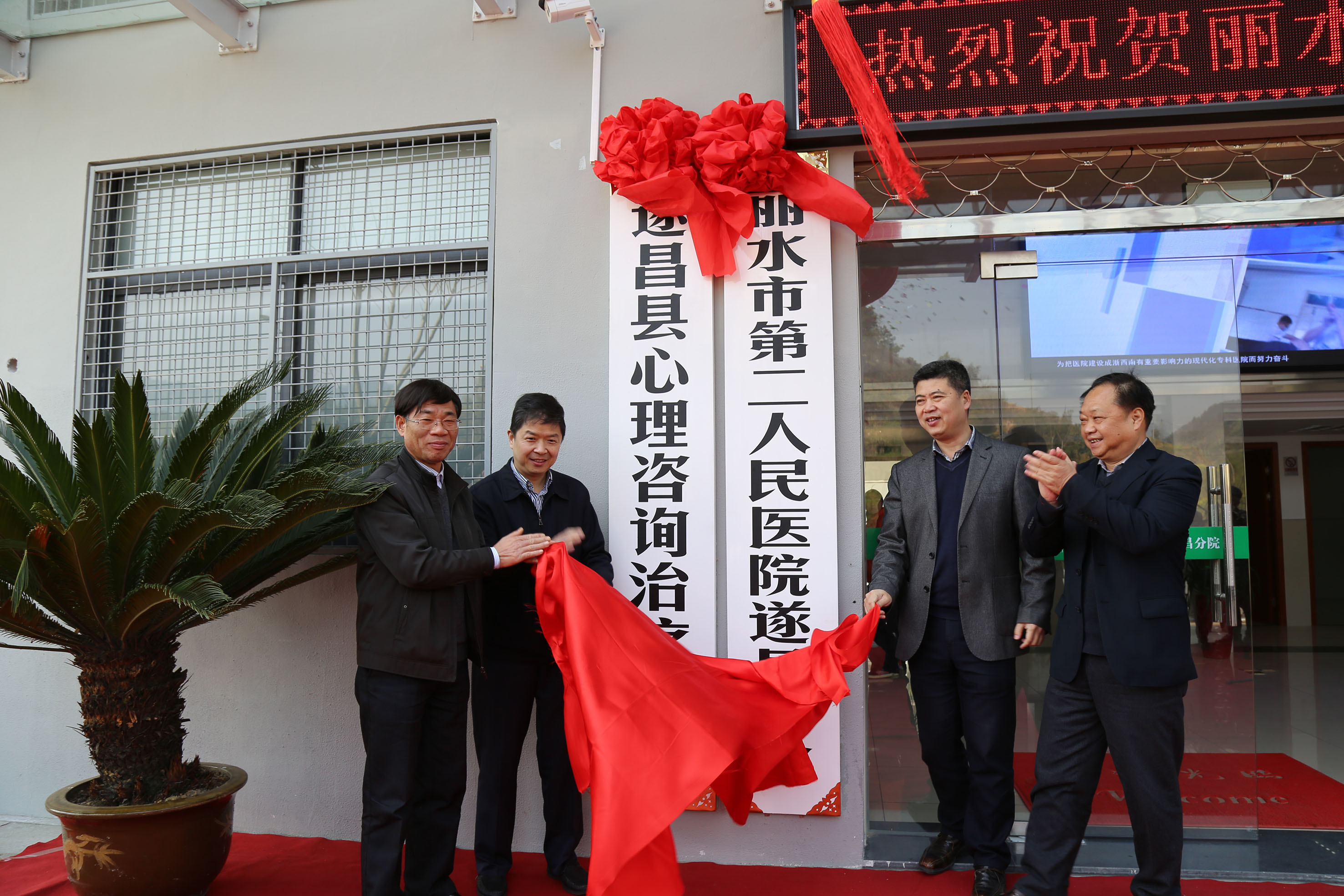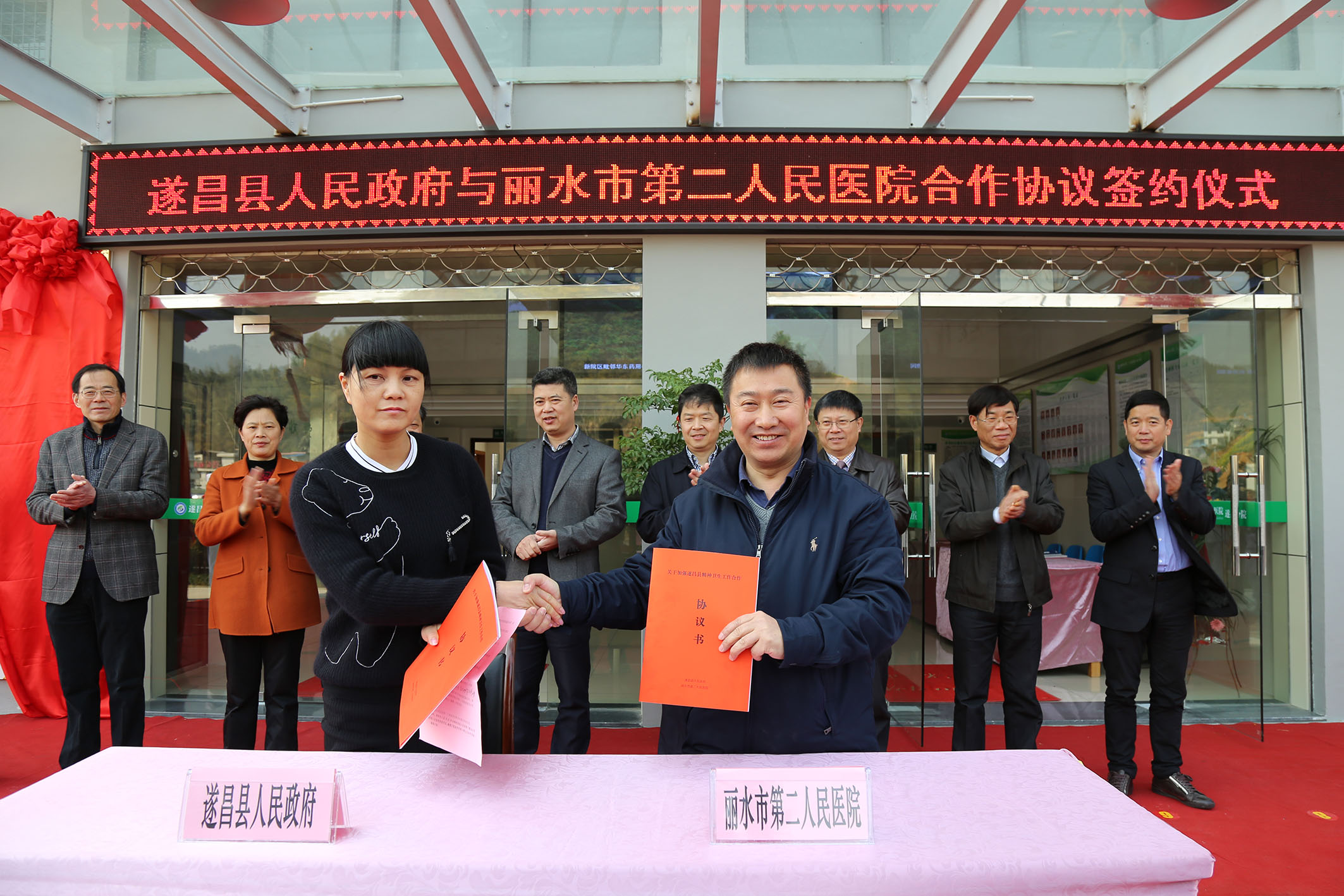 仪式上,省卫计委副主任徐润龙、市人民政府副秘书长王炜、市卫计委主任邱务土、遂昌县政协主席华治武共同为“丽水市第二人民医院遂昌分院”、“遂昌县心理咨询治疗中心”揭牌,李建霞副县长代表遂昌县政府与我院院长吴绍长签订了关于加强遂昌县精神卫生心理卫生工作的合作协议。