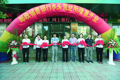 本报讯 9月28日,平阳县邮储银行水头营业所经两个多月的装修改造,在礼花、鞭炮声中重新开业。该局局长林胜寒,副局长李广东为开业剪彩。