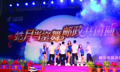 宴会中,以“家”为主题的文艺节目贯穿始终。由新入职员工表演的群舞“激情花火”体现了“寻家”进入邮政大家庭的喜悦;邮政双职工的情境表演“家合万事兴”体现了“成家”这一主题;歌曲串烧“花好月圆夜”等体现了员工热爱邮政大家庭的“爱家”主题。马屿支局投递员表演的“邮政三句半”通俗易懂,说出了广大邮政员工努力工作、快乐生活,期待邮政企业兴旺发达的愿景。鞠勇也即兴为在座的瑞安局全局员工深情献唱。