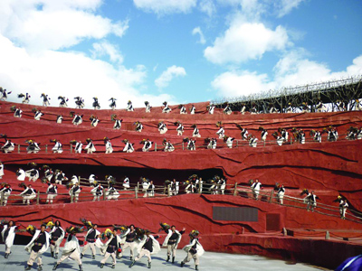 旅途的第三天是登玉龙雪山。这座历经千万年形成的雪山,最高海拔5596米,迄今无人征服。纳西族的胖金哥“陆导”带我们到了雪山脚下观看张艺谋等执导的大型实景演出《印象丽江》,在这海拔3100米之处,以蓝天为幕,大地作台,背景是无人征服的玉龙雪山,演员是附近16个村寨的10个少数民族农民。