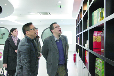 12月25日,省邮政公司副总经理裴英杰(右)一行在市局局长严明、党委书记孟一兵的陪同下来到温州邮政现代服务综合展示厅,参观了农特产品、函件、报刊、电子商务、业务体验等区域,现场探讨建设展示厅做法和经验。