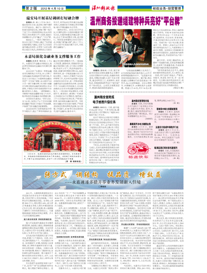 通过系列行之有效举措的实施和全员不懈努力,永嘉速递在市场开发上占据了主动,实现业务超常规发展,创造了良好经济效益,展现在员工面前的是公司发展、员工幸福的美好愿景。2012年,面对竞争激烈的速递市场,永嘉分公司将不唯计划唯市场,抢抓机遇,乘势而上,保持速递业务快速发展势头,为实现永嘉邮政速递物流做大做强目标而努力。