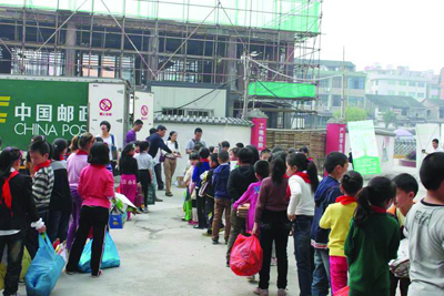 本报讯(徐 洁) 4月19日,乐清市白象镇一小里人声鼎沸、热闹非凡,小学生们在邮政邮车变身的废纸收集车前排起了长龙,按需用1公斤废纸换到了包括父亲节、母亲节、环境日、拒绝酒驾、教师节、中秋节、建队节等主题的贺卡,用它来书写心中话语寄递给父母、老师或同学。