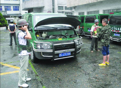 本报讯 6月6日,温州局安保部组织押运车队押运员、携款员、驾驶员等,冒雨开展“运钞车途中发生故障、运钞车途中发生火情、运钞车途中发生交通事故”三个科目的邮政运钞车应急预案实战演练。通过演练,让运钞押运人员熟练掌握应对各类突发事件的应急处置方法,提高押运人员的安全防范意识。(胡剑凯 摄影报道)