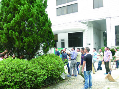 平阳局员工齐心协力将被狂风吹倒的大树扶正