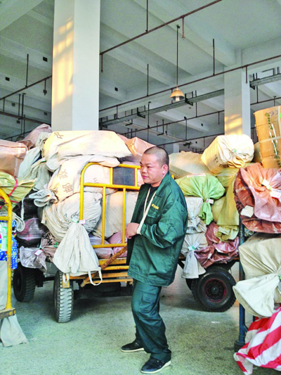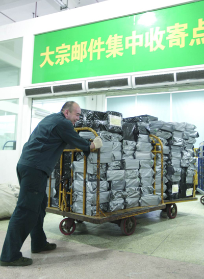 ▲员工把一车车的大宗邮件推往集中收寄点,满身疲惫仍面带笑容,干劲十足。□ 雷艳艳 摄