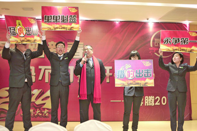市局局长严明作“出征口令”。他指出2013年温州局保险业务打了个大胜战,提前两个月完成了超10亿的战绩。经过一年的历练,财富中心日趋成熟,团队力量更加强大,保险运营的机制和管理体系更加成熟,如今我们可以独立地站在温州金融舞台上,这是我们的骄傲。2014年,又是一个新的挑战。温州的经济环境逐步趋向潮涨,已经走过了最困难的时期;保险业务在整个邮政金融资产占比还很低,不到6%,还有很大的发展空间;我们的团队有信心,有能力,有业绩,得到相关部门和机构更多的支持和帮助。因此,我们要有更大的信心,有更多的努力,不断挑战自己,为2014年保险业务的成就而努力拼搏,就一定能在更高处看到更好、更美的风景。严明表示, 2014年是马年,他已经着手准备一个神秘的礼物,将在2015年开门红时亲手授予礼物。