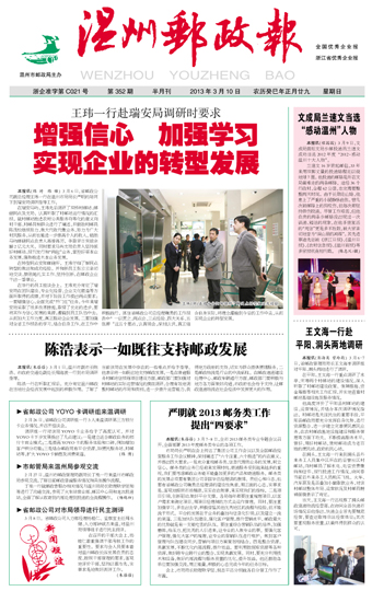 陈浩一行在听取汇报后,充分肯定温州邮政在当地社会经济发展中起到的积极作用,了解了当前该局在发展中存在的一些难点并给予指导。他表示将一如既往地支持邮政发展,一是在普遍服务村邮站信报箱项目建设方面,邮政部门要加强对村邮站的实际运营情况的摸底调研,合理有效地调整村邮站的布局和类别,进一步提升运营能力,获得地方政府的支持,切实为群众提供便捷服务。二是邮政物流是行业的中流砥柱。在邮政速递建设处理中心、邮政车辆通行方面,邮政部门要积极与地方各方面做好沟通,市政府也会给予支持,让邮政速递物流在社会经济中发挥更大的作用。