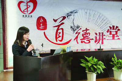 本报讯 “中国老百姓,炎黄好儿孙,重情重义重品行,立志先立人.....”,3月29日下午,永嘉局2013年度一季度道德讲堂在一曲《公民道德歌》中拉开帷幕。在“学一首歌、看一部短片、讲一个故事、诵一段经典、做一番点评”流程的基础上,永嘉局今年道德讲堂活动与开展“发现‘最美邮政人’、争做‘最美邮政人’”主题宣传活动相结合,通过道德讲堂发现、培育、宣传一批“最美邮政人”,充分发挥榜样的示范、激励和带动作用。