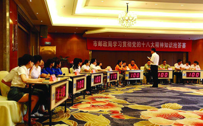 据悉,为推动十八大精神的学习贯彻落实,引导全市邮政职工把握精神实质、领会深刻内涵、统一思想行动,把智慧和力量凝聚到十八大确立的各项任务上来,该局确立了学习十八大精神“六个一”,并将其作为该局今年的重点工作考核,包括“制定一个学习计划、上好一堂专题党课、撰写一篇学习心得、作出一个公开承诺、亮一个工作亮点、组织一次知识竞赛”,目前已基本完成了系列活动内容。(金文斌/摄)