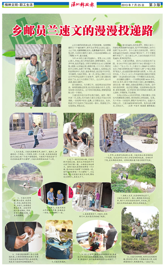 今年49岁的兰速文是畲族人,更是土生土长的山里人,具有山里人特有的淳朴、憨厚和善良。这么多年来,他负责富岙、支垟方向两条长达62公里的邮路,凌晨3点多就出班,傍晚归班,日久天长,哪家定的什么报纸,他都了然于胸。投递路上,经常有山民托他带些种子、药品、面条等物品,他总是不怕辛苦、不怕麻烦,为他们带到。有一次,家住山顶的兰大伯还半开玩笑让他带只小猪来养,结果兰速文真的给他送了去,让兰大伯感动了很久。这么多年,他从未误递、错送过邮件。