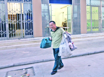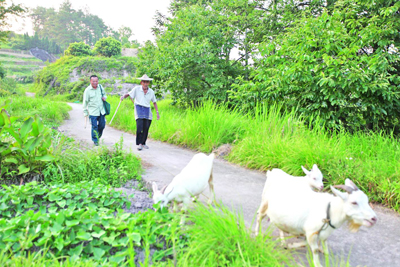 7、傍晚6点多,沉重的邮袋也空了,兰速文也归班了。路上,遇到赶羊的老大爷,两个人用本地话打招呼,不时地,兰速文还用他的扁担,帮老大爷赶赶羊。