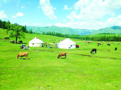 蔚蓝的天空时不时有山鹰在翱翔,银装素裹的雪山,黛绿色的西伯利亚落叶松和雪岭云杉,淡绿色的草原点缀着无数黄色和紫色为主的小花,白色的毡房,棕色的骏马,五颜六色的羊群,黑白相间的奶牛,甘甜的奶酪,美味的烤羊肉,忠诚的猎狗……大自然赠与新疆那拉堤大草原的这些美好和自由深深吸引我们远道而来的游客。触目所及皆是一望无际的辽阔草原,只让人感到无比畅快,畅快!