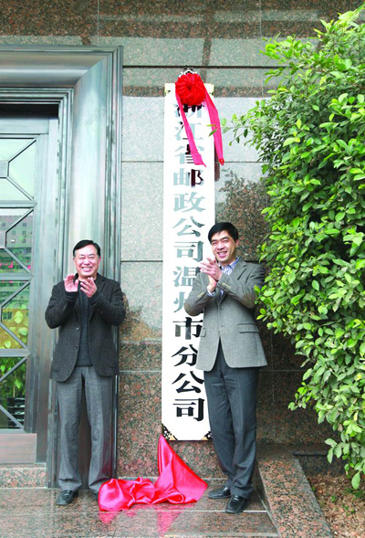 从2月28日起,温州市邮政局正式更名为浙江省邮政公司温州市分公司。省邮政公司副总经理李革平,市分公司领导出席了当天的揭牌仪式。市分公司总经理严明(右),党委书记孟一兵(左)一同揭牌。(朱蓓蓓/文 叶会洲/摄)