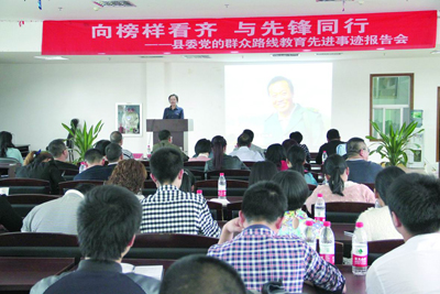 本报讯 5月7日,文成县委组织“向榜样看齐,与先锋同行”党的群众路线教育先进事迹报告会,全县各机关单位党员干部共同学习文成县邮政局乡邮投递员兰速文的先进事迹。