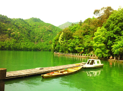 绕了一圈,回到渡口,我们又坐游船驰向下一个景点——龙潭。一到码头,便发现一伙摄影爱好者邀请了几个年轻模特来此拍照。小姑娘坐在潭边岩石上,用脚戏水,潭水幽幽,深不可测,周围则砥石层叠,丛林茂盛,碧泉淙淙。摄影师们或蹲或站,聚焦小姑娘,镁光灯闪不停,山林野趣夹杂着现代气息,煞是有趣。我们坐在旁边的农家乐里,看着乐。之后便沿着溪水,追踪溯源,寻找龙潭发源地。一路上,奇石憐恂,流泉飞珠溅玉,渗透着泉水的岩石上爬滿青苔。山边则灌木丛生,不时要跨过竹桥、古道,也有未建好的休憩廓亭等你。最终是一组又高又大的岩石群霸道地挡住了我们的路,一块石头上刻着“龙井”二字。据说这里分布着钓鱼岩、纱帽岩、金奶岩、寿桃岩等50多块怪石,组成一道独特的亮丽风景。