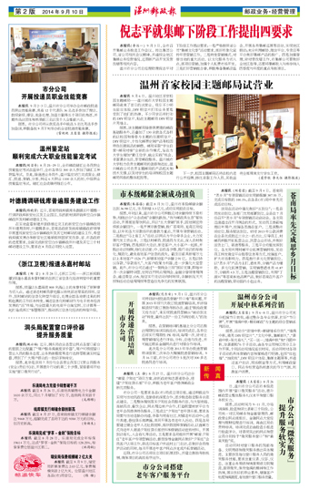 本报讯 9月2-3日,温州市分公司举办全市邮政投递员职业技能竞赛,共有12个代表队36名选手参加了理论、数报套报、排信、批条处理、加盖日戳等五个项目的角逐,并最终决出团体和单项前三名以及个人全能前六名。